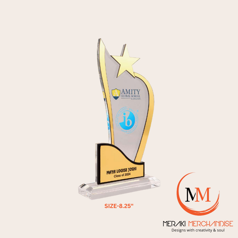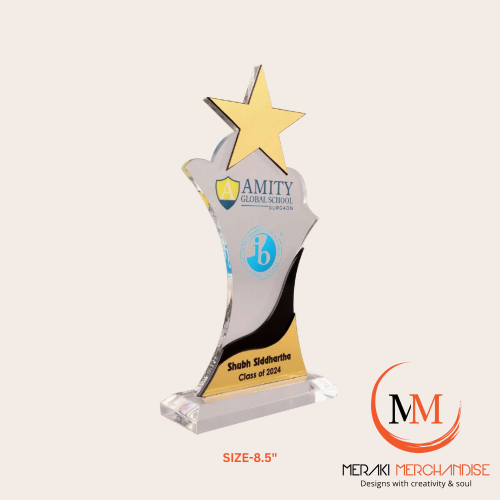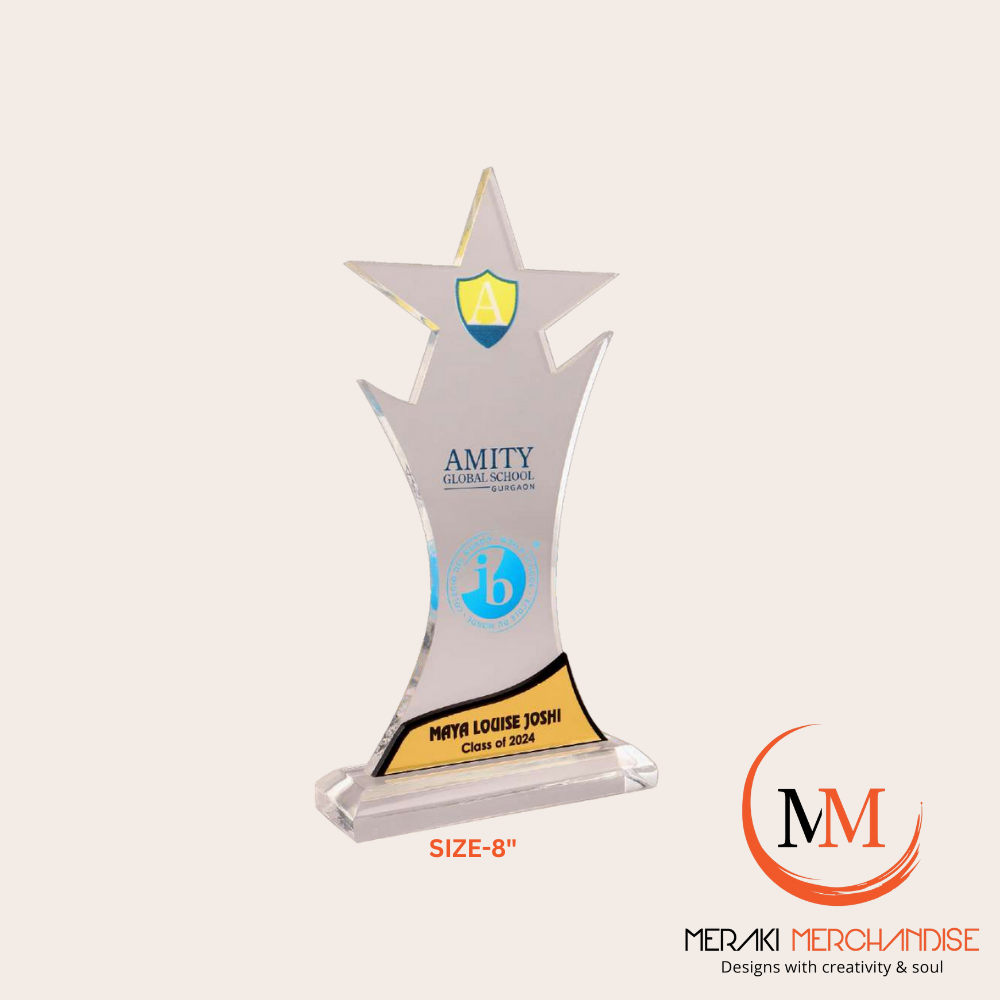 Recognize success with the Meraki Star Curve Acrylic Award (8.25 inch height), crafted from premium acrylic with smooth finishing and an elegant star-curve design. Ideal for corporate gifting, educational institutions, and events. Fully customizable with names, logos, or complete personalized designs.