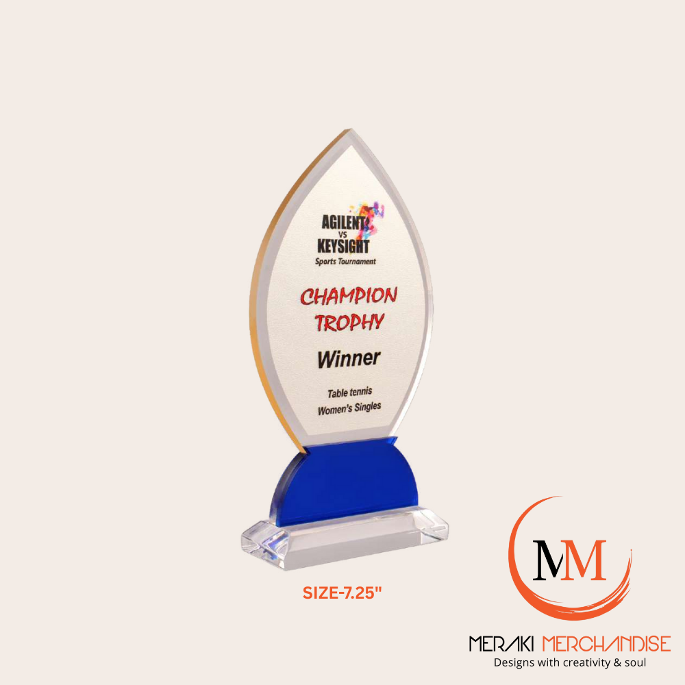 Premium 7.25-inch acrylic award by Meraki Merchandise with excellent finishing and a modern flame-style design. Ideal for sports tournaments, corporate gifting, events, employee recognition, and award ceremonies. Available with single-name personalisation or complete customisation with your logo and design.