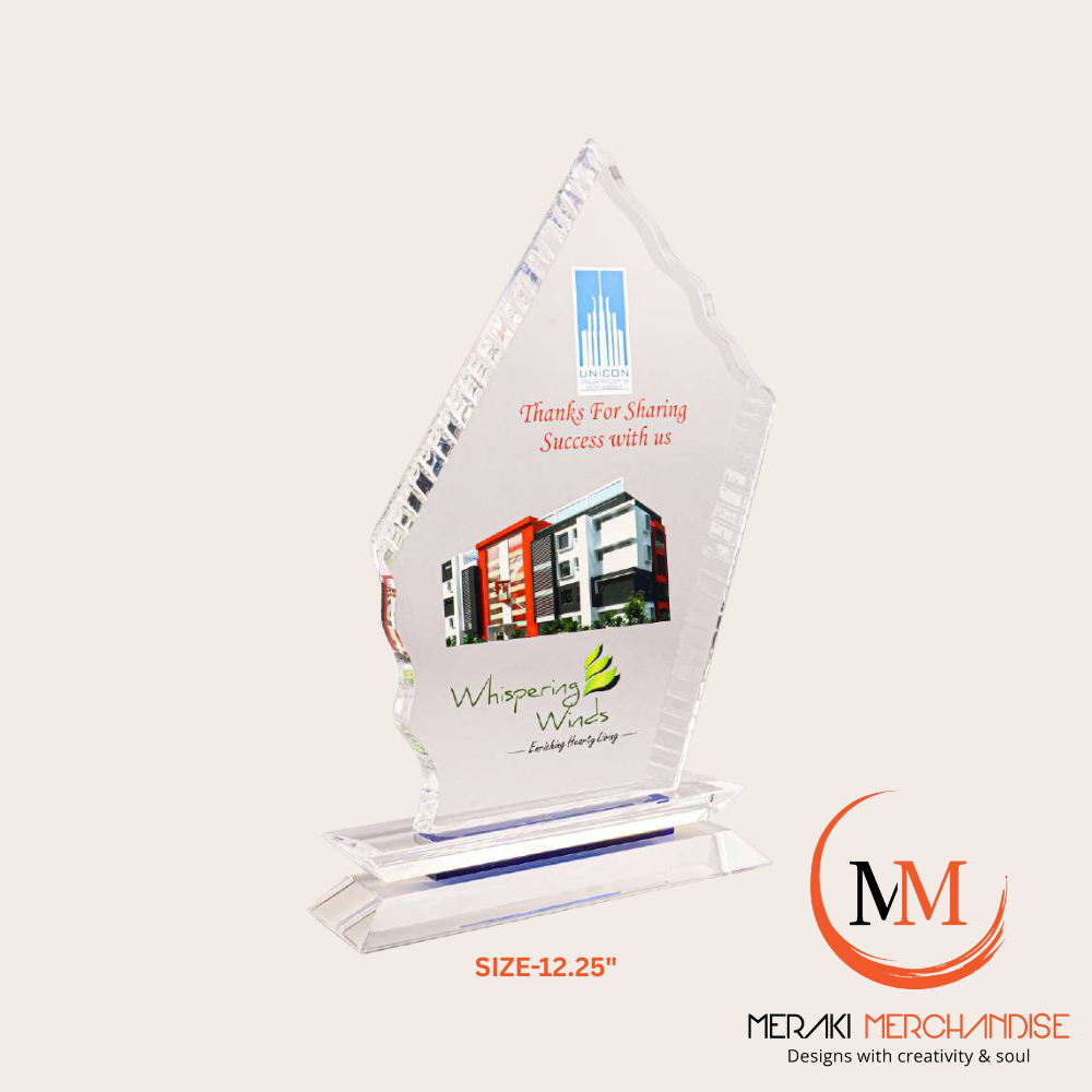 Celebrate successful collaborations and achievements with the Meraki Merchandise 12.25-inch Premium Acrylic Award (Size-12.25 “Whispering Winds” Realty). This striking customizable trophy features a unique shield/house shape and blue accents, perfect for corporate gifting, real estate events, and recognition. Fully customizable for any recipient or occasion.
