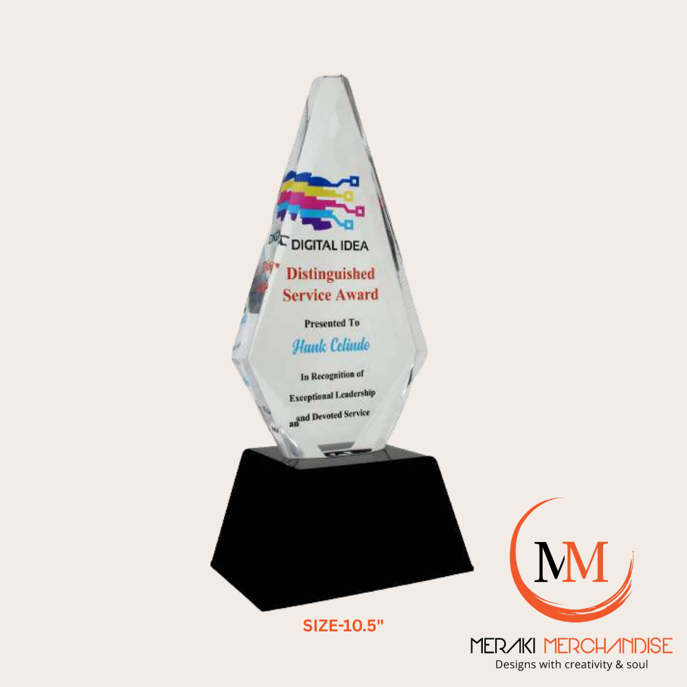 Acknowledge exceptional leadership with the Meraki Merchandise 10.5-inch Distinguished Service Award (Size-10.5 Diamond). This premium acrylic trophy features a striking diamond-cut design, a vibrant graphic, and a solid black base, perfect for corporate gifting, events, and recognition. Fully customizable for any recipient or occasion.