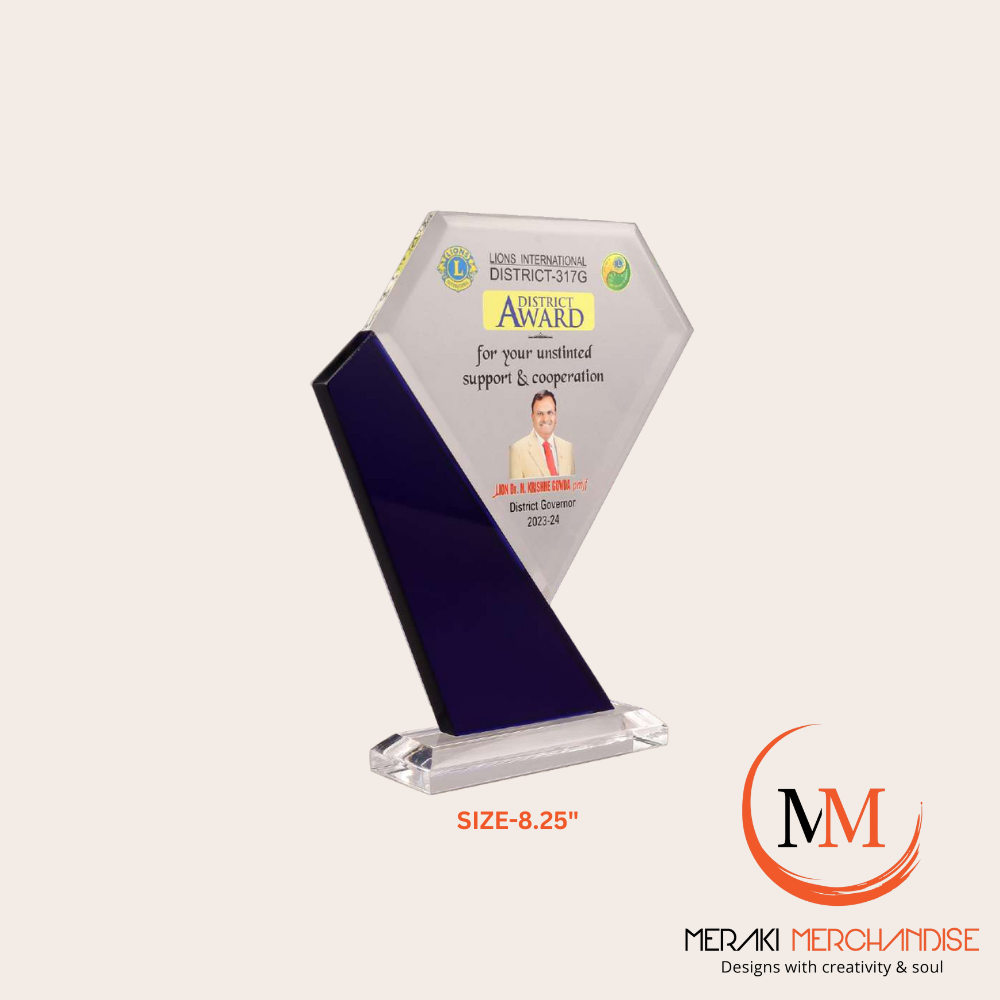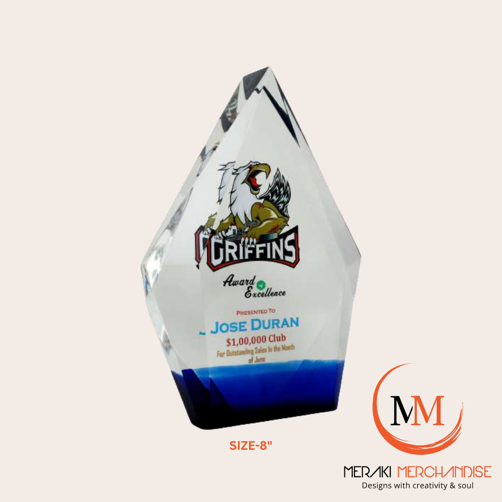Celebrate outstanding achievements with the Meraki Merchandise 8-inch Outstanding Achievement Award (Size-8 Diamond Blue). This premium acrylic trophy features a striking faceted design and a vibrant blue base, perfect for corporate gifting, sales events, and recognition. Fully customizable for any occasion or recipient.