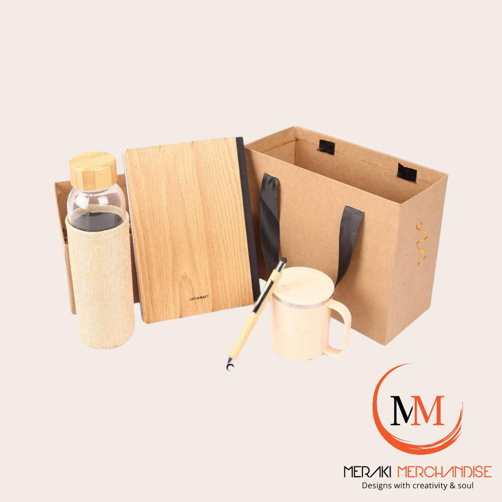 Introduce sustainability and style with the Meraki Eco Essentials New Joining Kit, a thoughtfully curated corporate gift set featuring a glass bottle with sleeve, wooden notebook, eco coffee mug, pen, and premium paper gift bag. Perfect for employee onboarding, corporate gifting, and events, with complete customization options available.