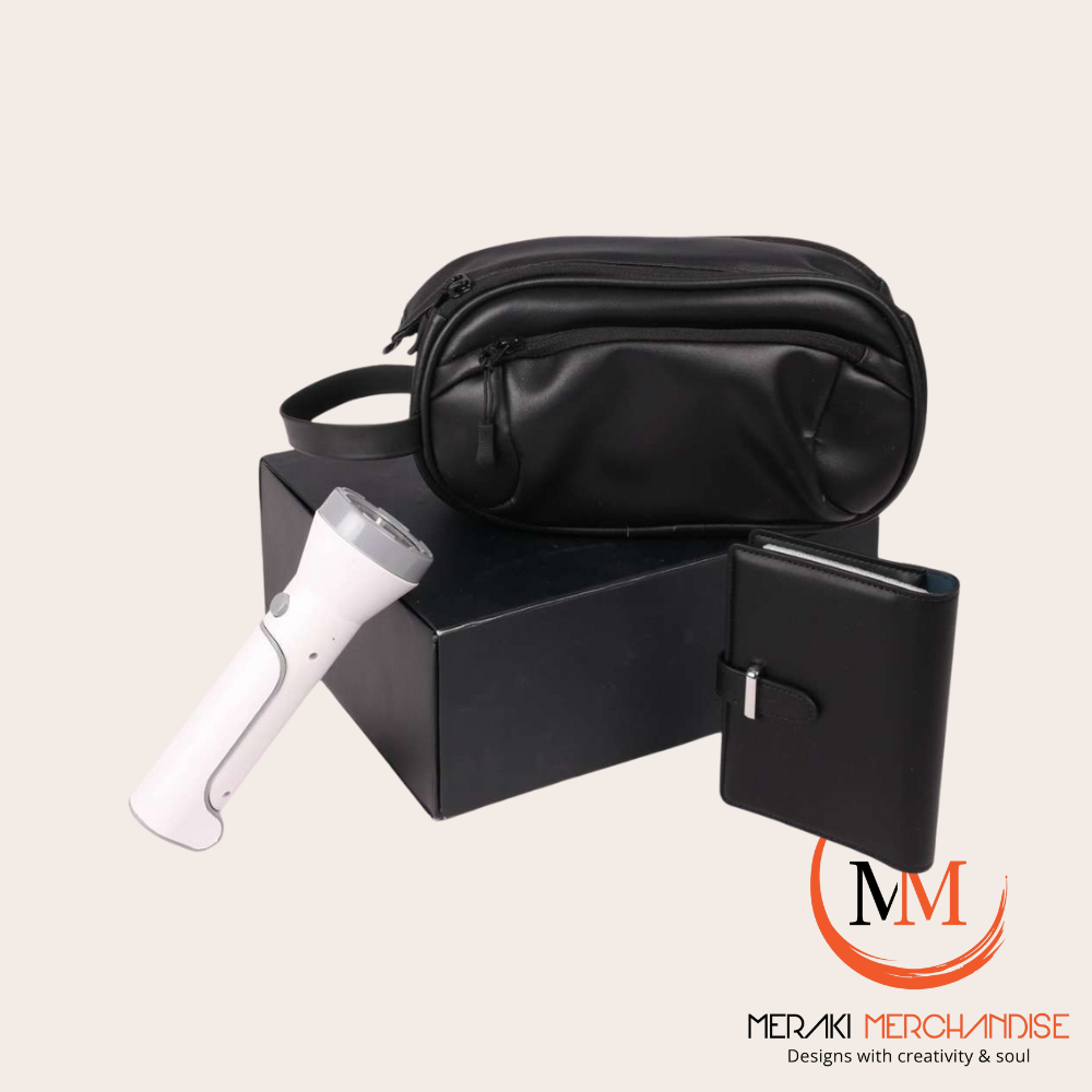 Make a strong professional impression with the Meraki Executive Utility New Joining Kit, a premium corporate gift set featuring a utility pouch, LED torch, executive notebook wallet, and luxury gift box. Ideal for employee onboarding, corporate gifting, and events, with full customization options available.