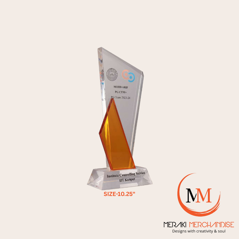 Acknowledge outstanding academic or corporate achievements with the Meraki Merchandise 10.25-inch Premium Acrylic Award (Size-10.25 IIT Kanpur). This striking customizable trophy features a vibrant amber/orange geometric design, perfect for corporate gifting, educational events, and recognition. Fully customizable for any recipient or occasion.