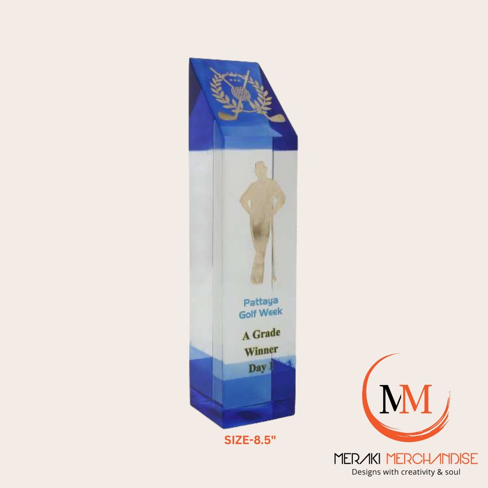 Celebrate golf achievements with the Meraki Merchandise 8.5-inch Outstanding Achievement Award (Size-8.5 Golf). This unique acrylic trophy features a detailed golfer silhouette and striking blue accents, perfect for corporate events, golf tournaments, and recognition. Fully customizable for any occasion or recipient.