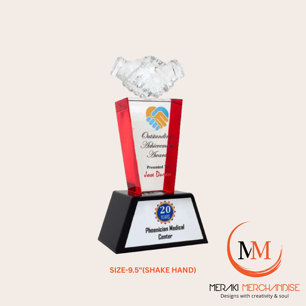 Celebrate successful partnerships and achievements with the Meraki Merchandise 11-inch Outstanding Achievement Award (Size-11 Shake Hand). This premium acrylic trophy features a striking handshake topper and a sleek black base, perfect for corporate gifting, events, and recognition. Fully customizable for any occasion or recipient.