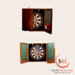 The cabinet opens to reveal a high-quality dart board with clearly marked scoring zones, ensuring accurate and enjoyable gameplay. The inner panels provide convenient storage for darts, keeping everything organized and protected when not in use. When closed, the cabinet transforms into a sleek wooden wall piece, adding elegance to any space.