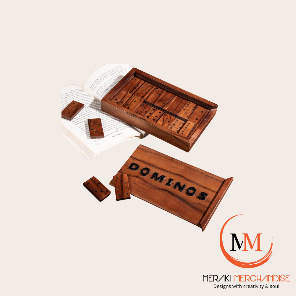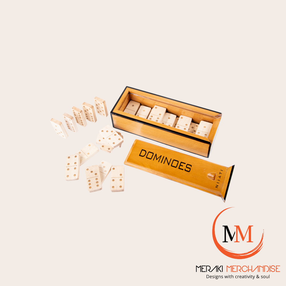A luxury handcrafted wooden Dominoes game set by Meraki Merchandise, designed for premium corporate gifting and events. Featuring a finely finished wooden box and classic domino tiles, fully customizable with names, logos, or bespoke designs to elevate your brand presence.