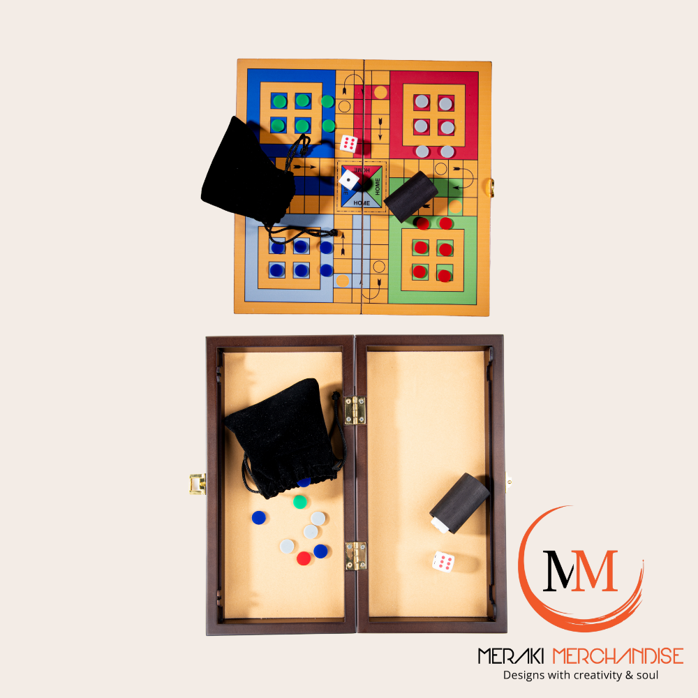 Enjoy timeless fun with the Meraki Premium Wooden Ludo Board Game Set, featuring a vibrant foldable board, wooden storage box, dice, and tokens. Fully customizable and ideal for corporate gifting, events, and brand promotions.