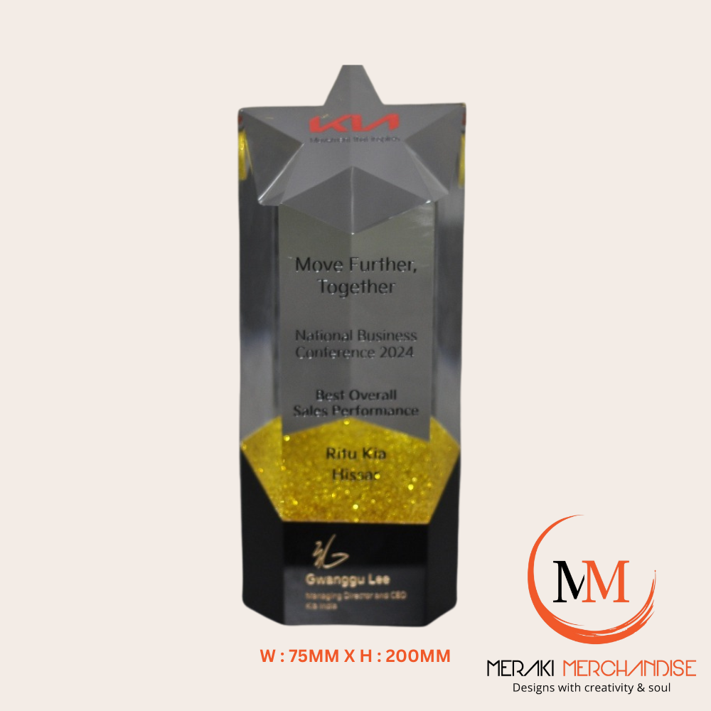 Celebrate outstanding achievement with the Meraki Starcrest CRYSTIL Award, a premium crystal trophy measuring 75mm (W) x 200mm (H). Featuring a bold star-top design with elegant crystal clarity and superior finishing, this award is ideal for corporate gifting, sales recognition, leadership awards, and business events. Fully customizable with names, logos, messages, or complete bespoke designs—everything is possible with Meraki Merchandise.