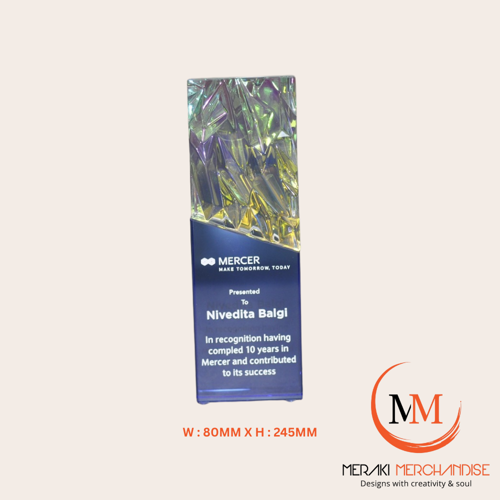 Recognize excellence with the Meraki Apex Pillar CRYSTIL Award, a premium crystal trophy measuring 55mm (W) x 300mm (H). Featuring a tall, sleek pillar design with superior finishing, this award is ideal for corporate gifting, recognition ceremonies, defense & institutional events, and premium awards. Fully customizable with names, logos, messages, or complete bespoke designs—everything is possible with Meraki Merchandise.