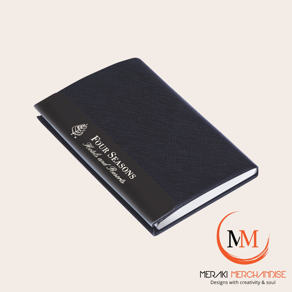 Crafted from premium textured faux leather, it features a sleek black finish with a metallic accent strip embossed with the “Four Seasons Hotels and Resorts” logo — representing timeless luxury and refined craftsmanship. The compact yet durable design makes it an ideal companion for meetings, conferences, and travel, ensuring your business cards and IDs are always presented in style.