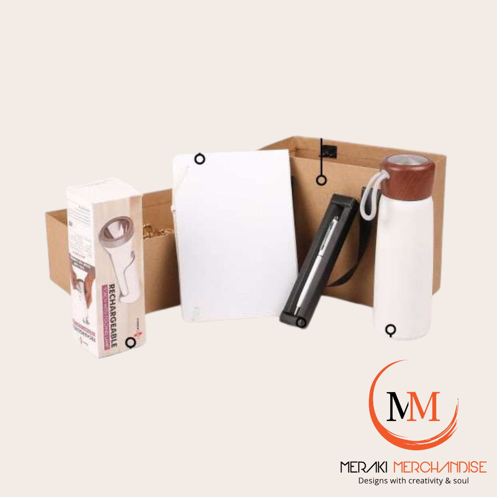Welcome new team members with the Meraki Premium Utility New Joining Kit, a versatile corporate gift set featuring a rechargeable torch, notebook, pen, insulated water bottle, and premium kraft packaging. Ideal for employee onboarding, corporate gifting, and events, with complete customization options available.