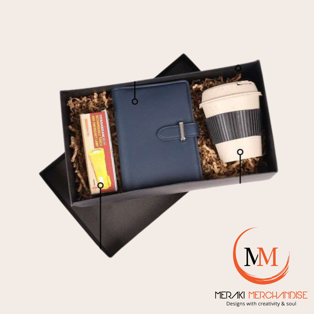Welcome new employees in style with the Meraki Executive Essentials New Joining Kit, a refined corporate gift set featuring an executive notebook, reusable coffee cup, utility light, and premium gift box. Perfect for employee onboarding, corporate gifting, and events, with complete customization options available.